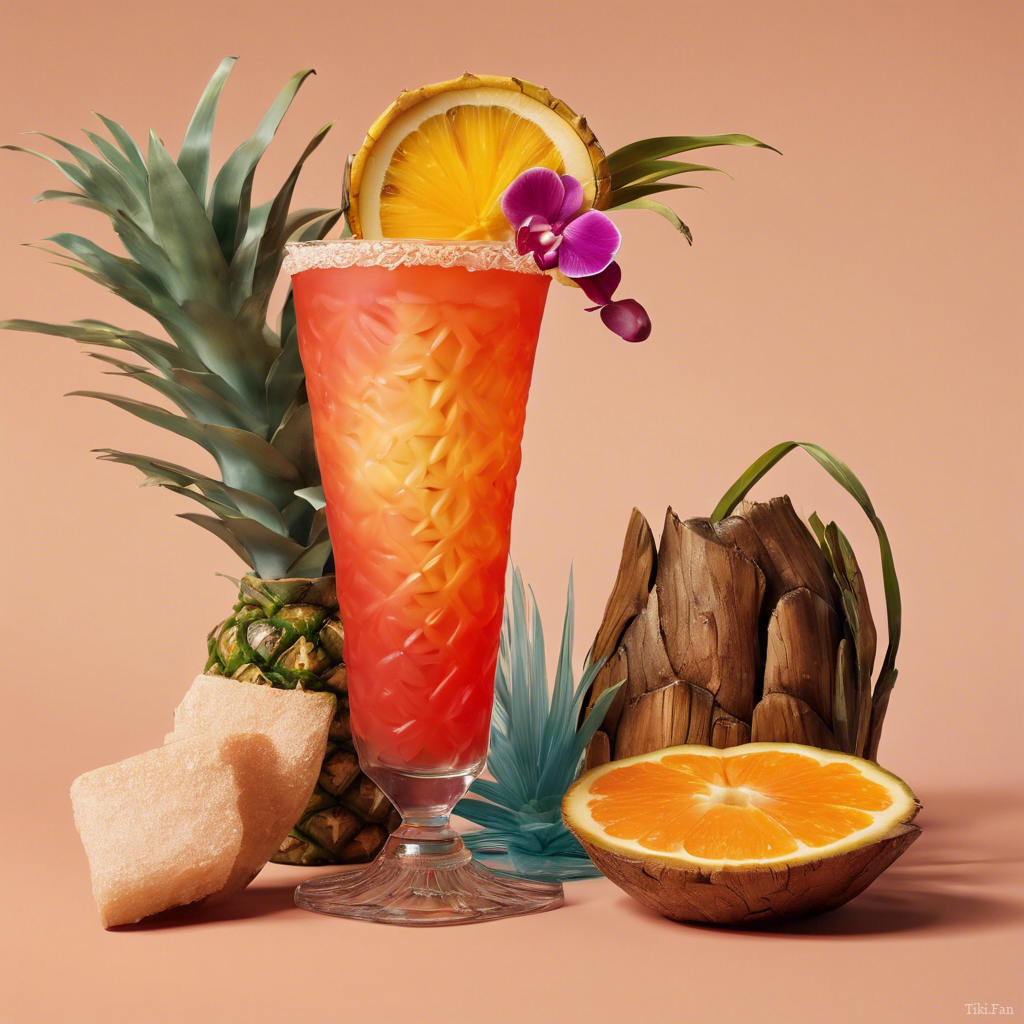 - Garnish: pineapple fronds, orchid, orange floret, and parasol (orange twist and paper umbrella)