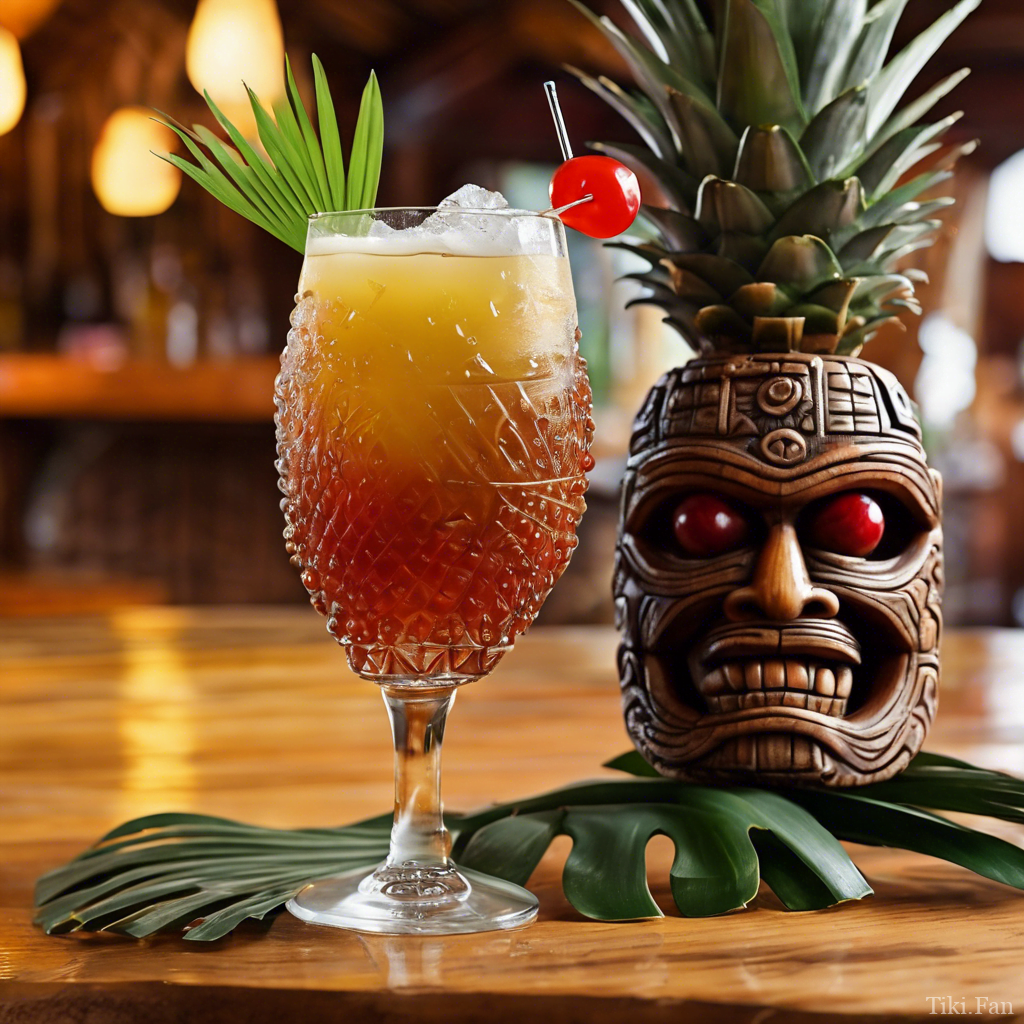 - Garnish: Three cherries on a cocktail pick and a pineapple frond