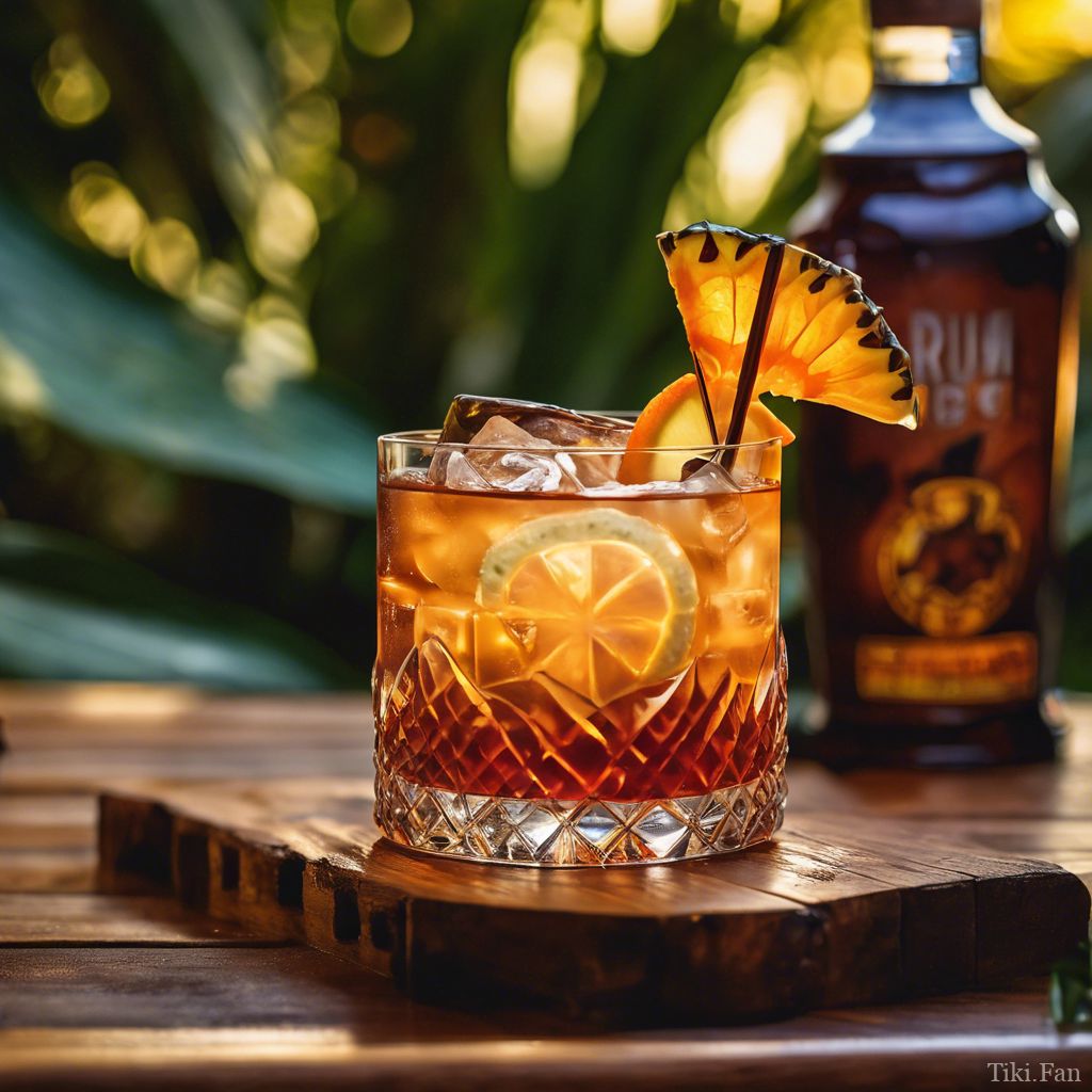 To make the drink, simply stir all of the ingredients (except for the Tiki Bitters and orange twist) with ice in a mixing glass until well-chilled. Strain the mixture into a double old fashioned glass over a large ice cube. If desired, add a dash of Tiki Bitters on top of the drink as a garnish. Finally, express the orange oil from the twist over the drink and drop the twist into the glass.